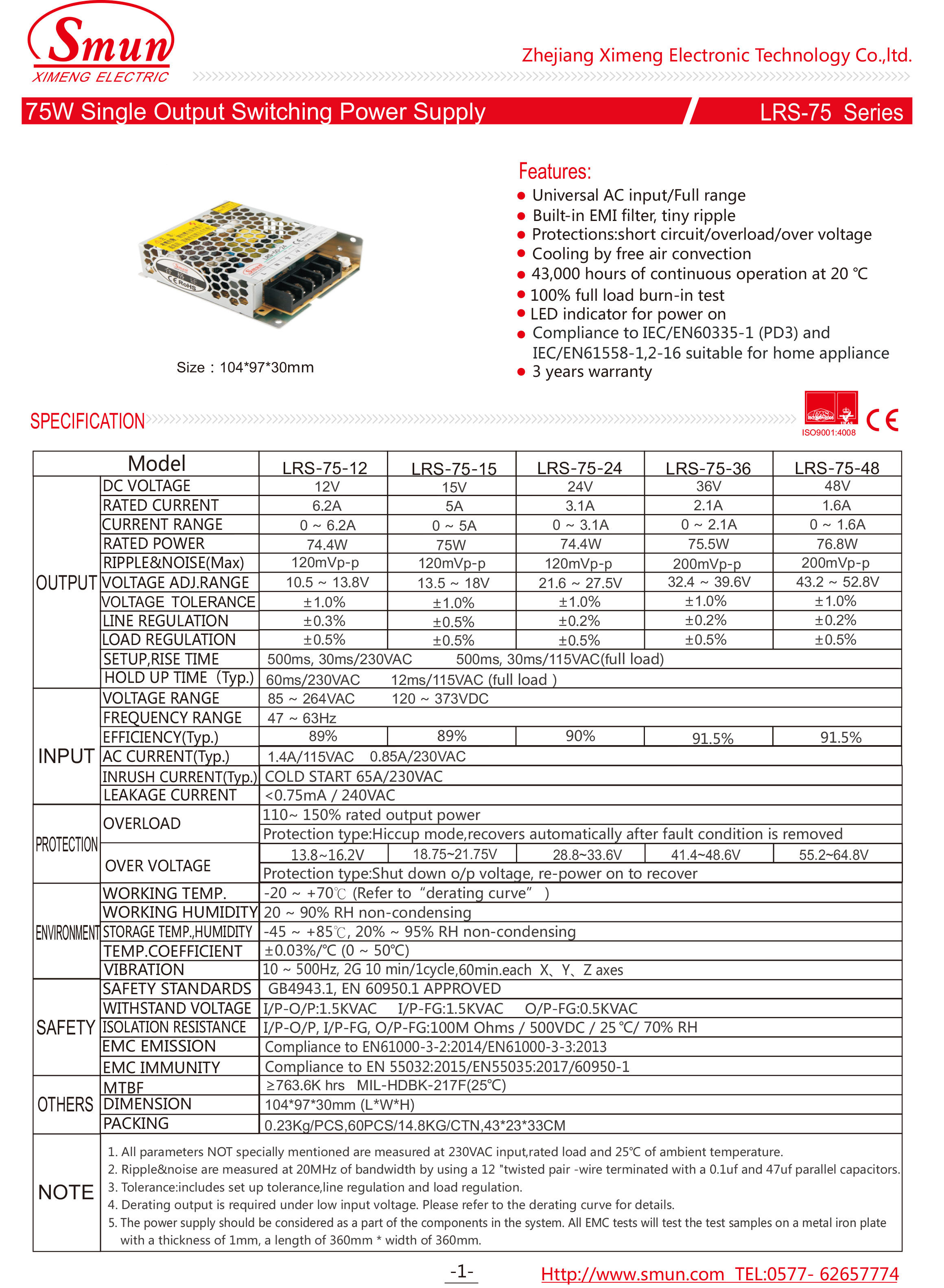 LRS-75系列是75W单路输出封闭式电源,30mm薄型设计。采用全范围85-264VAC输入,全系列提供5V、12V、15V、24V、36V和48V输出电压线.