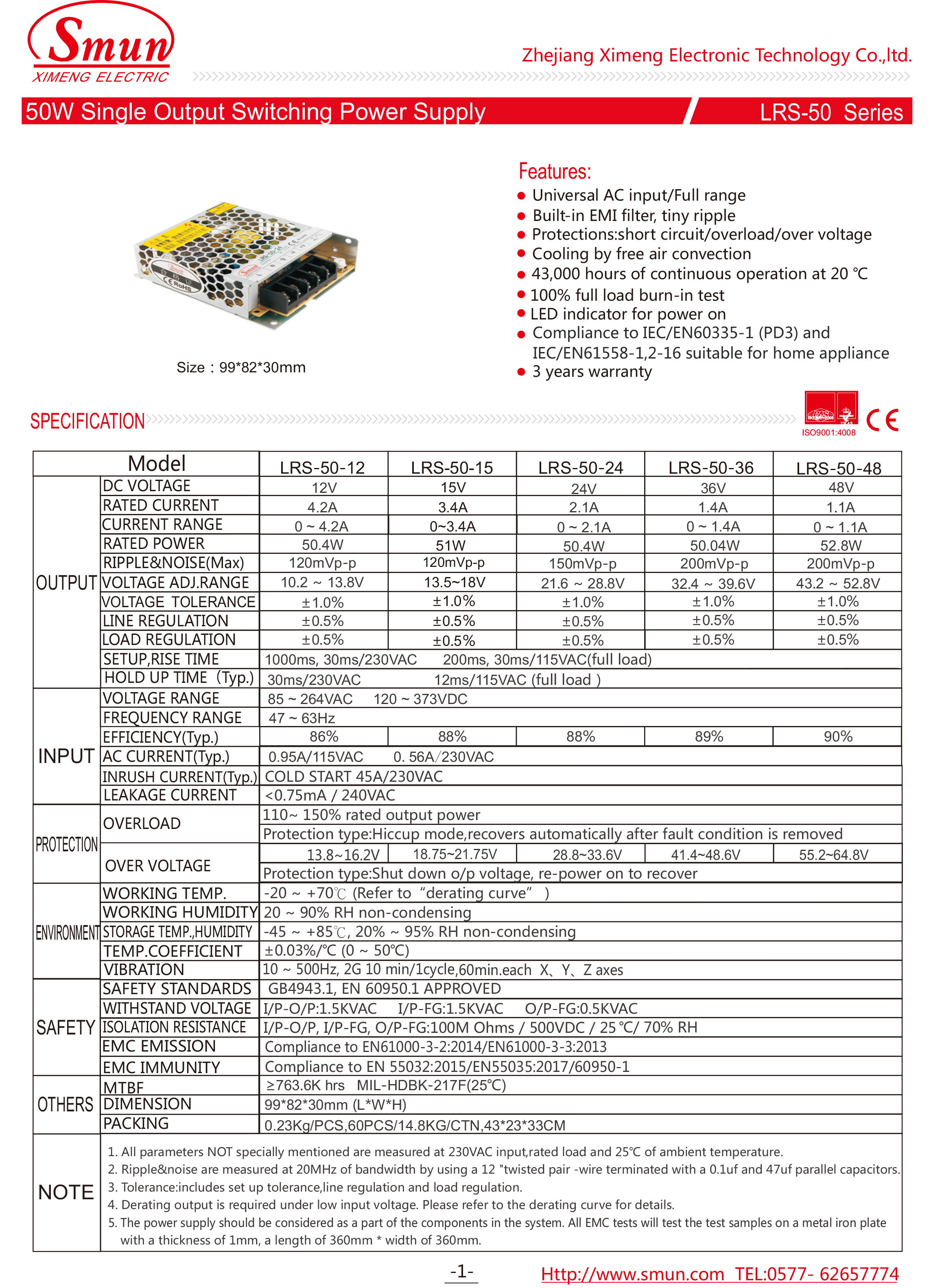 LRS-50系列是50W单路输出封闭式电源,30mm薄型设计。采用85-264VAC全范围输入,全系列提供5V、12V、15V、24V、36V和48V输出电压线.